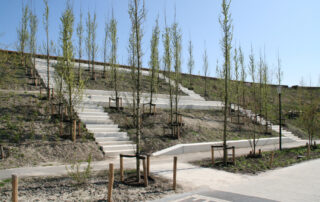 Het ontwerp van de openbare ruimte is in handen van landschapsarchitect Patrick Ruijzenaars, die de wijk vanaf het begin heeft vormgegeven. Hij koos ervoor om het park als uitgangspunt te nemen, dat als een ‘groen draad’ door de woonwijk loopt. Zijn visie komt duidelijk naar voren in de zichtas die het monumentale Shellgebouw via een grote vijver verbindt met een indrukwekkende trap. Deze trap, opgebouwd uit Bio Bound zitbanken type Elegance, wordt geflankeerd door statige populieren en frivole sierkersen en vormt de kern van een verticaal bospark. Bewoners kunnen er heerlijk zitten met uitzicht op de vijver, maar de trap nodigt ook uit om sportief te worden gebruikt bij fitnessoefeningen.