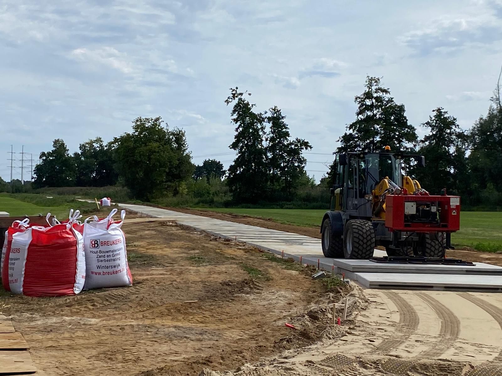 Het vaste legteam van Bio Bound is volop bezig met de aanleg van het fietspad en legt daarbij in rap tempo zo’n 75 platen per dag. Het fietspad is naar verwachting in oktober klaar en wordt later dit jaar feestelijk geopend samen met het Almende College.