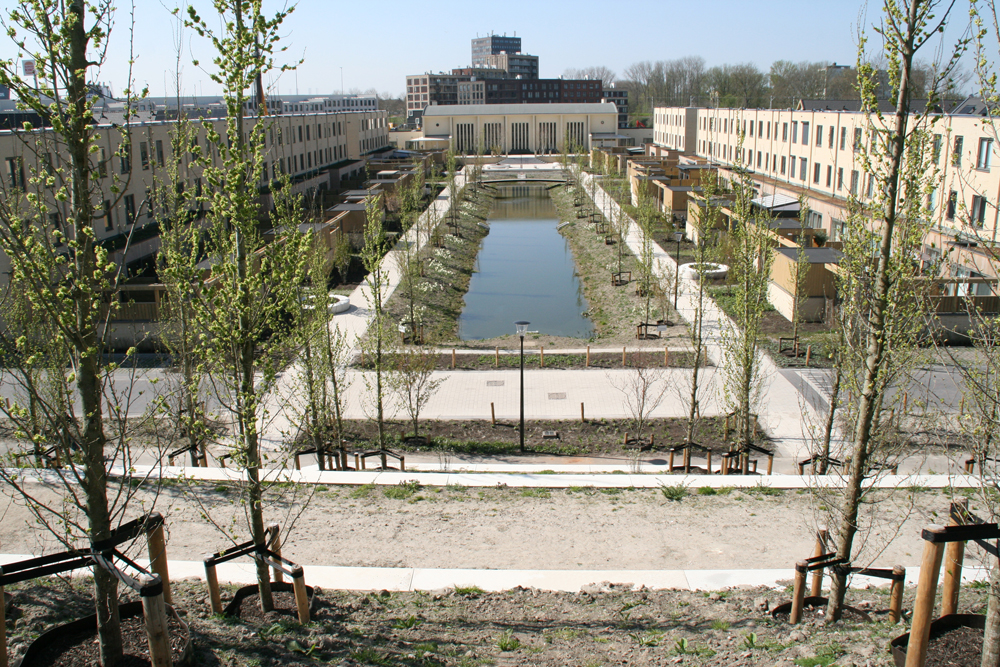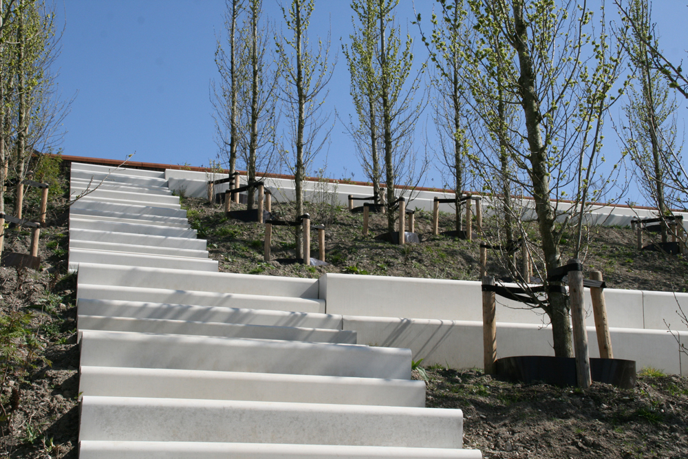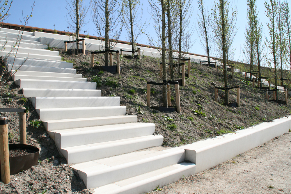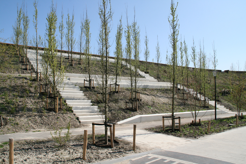 Het ontwerp van de openbare ruimte is in handen van landschapsarchitect Patrick Ruijzenaars, die de wijk vanaf het begin heeft vormgegeven. Hij koos ervoor om het park als uitgangspunt te nemen, dat als een ‘groen draad’ door de woonwijk loopt. Zijn visie komt duidelijk naar voren in de zichtas die het monumentale Shellgebouw via een grote vijver verbindt met een indrukwekkende trap. Deze trap, opgebouwd uit Bio Bound zitbanken type Elegance, wordt geflankeerd door statige populieren en frivole sierkersen en vormt de kern van een verticaal bospark. Bewoners kunnen er heerlijk zitten met uitzicht op de vijver, maar de trap nodigt ook uit om sportief te worden gebruikt bij fitnessoefeningen.